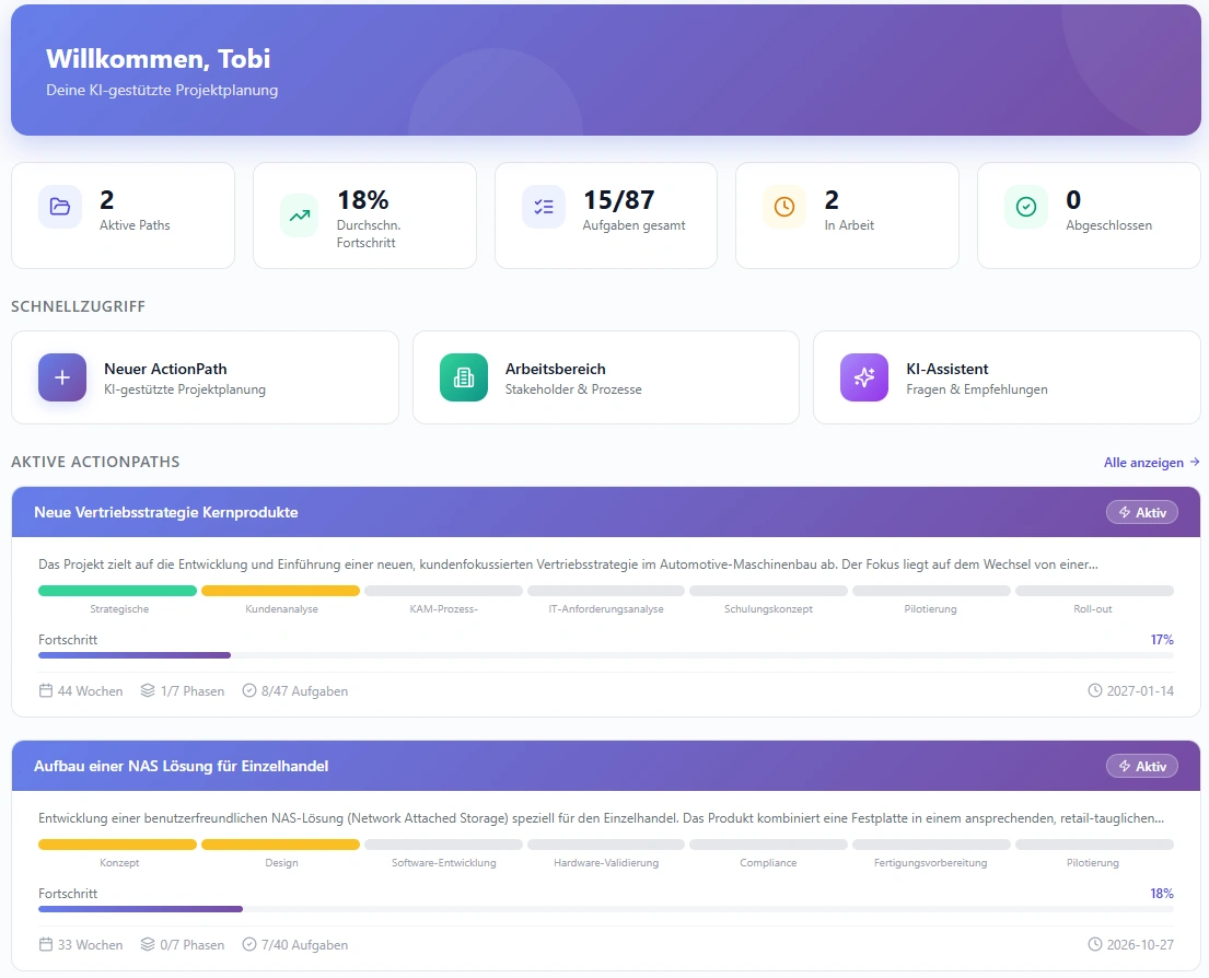 „Wir wollten ursprünglich nach Trello exportieren – aber das Projektmanagement in PathHub AI ist so gut, dass wir alles hier tracken. Aufgaben, Budget, Meilensteine – alles an einem Ort."